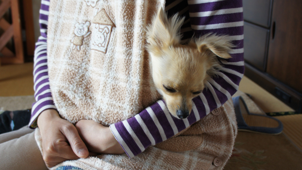 家のワンコは寒いときは、妻の服の中にはいってきてカンガルーのように寝ます。。。決してプロレスごっこをしているわけではありません。
