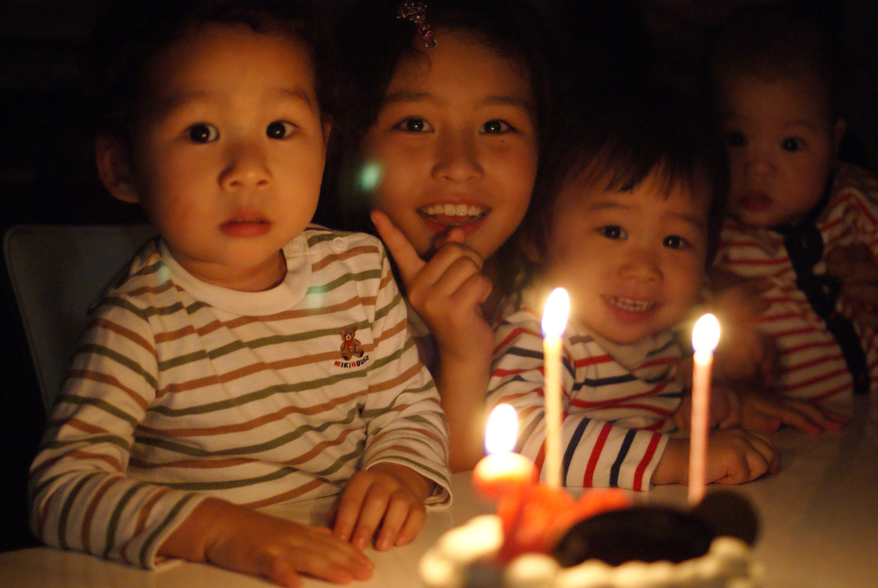 しましまの二人が2才になりました。 かなりにぎやかです。 ろうそくの光が写りこんだ様ですが、これなんでしょう?