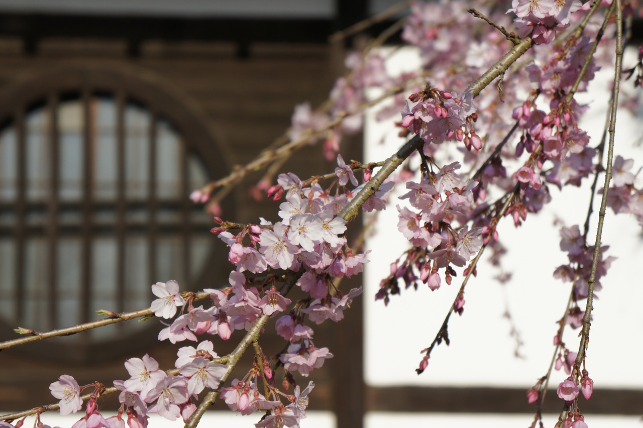 お寺の壁を背景にしだれ桜を撮影してみました。