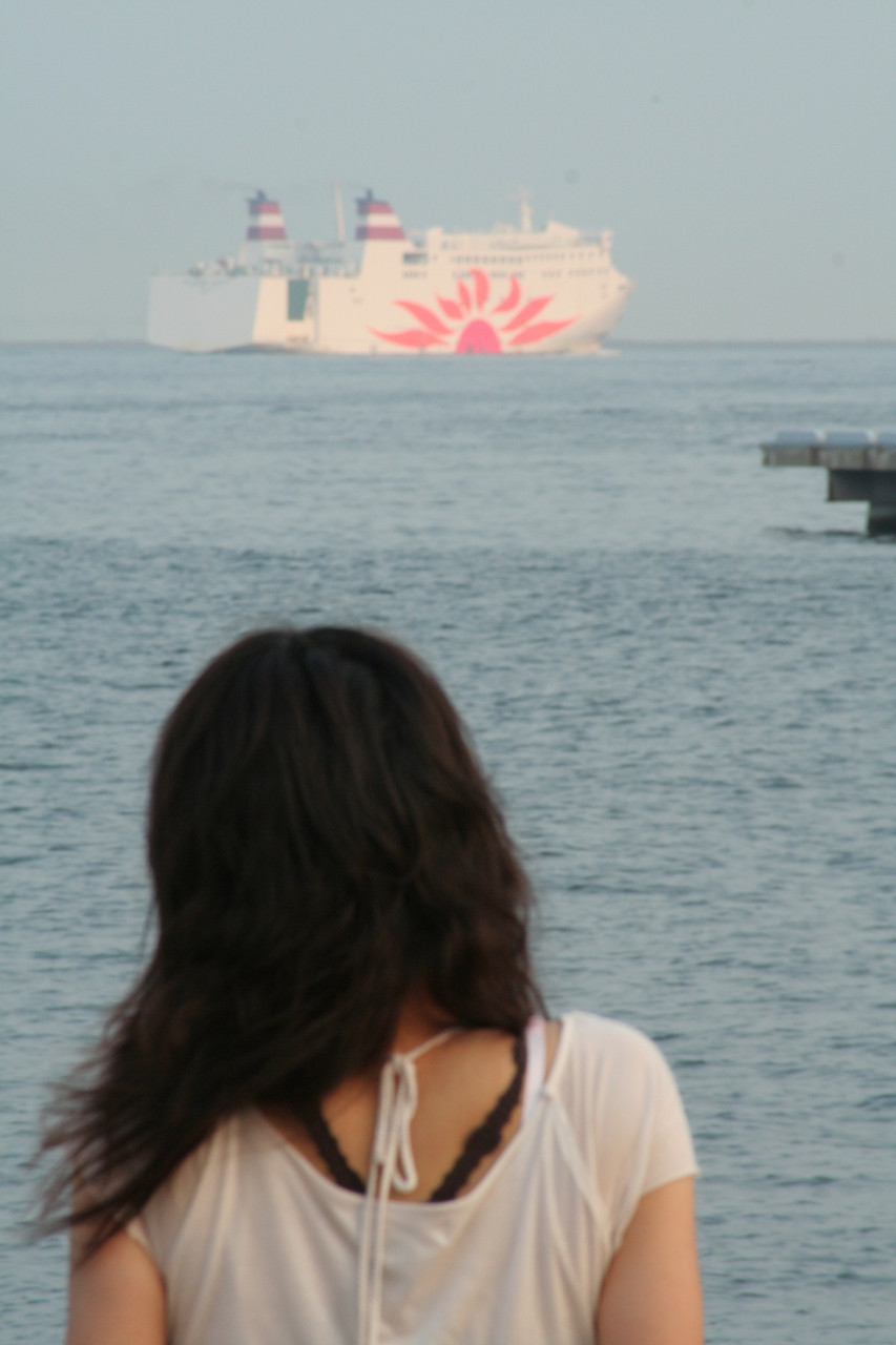 ハーバーランドで女性が、さんふらわー号を見つめていました。