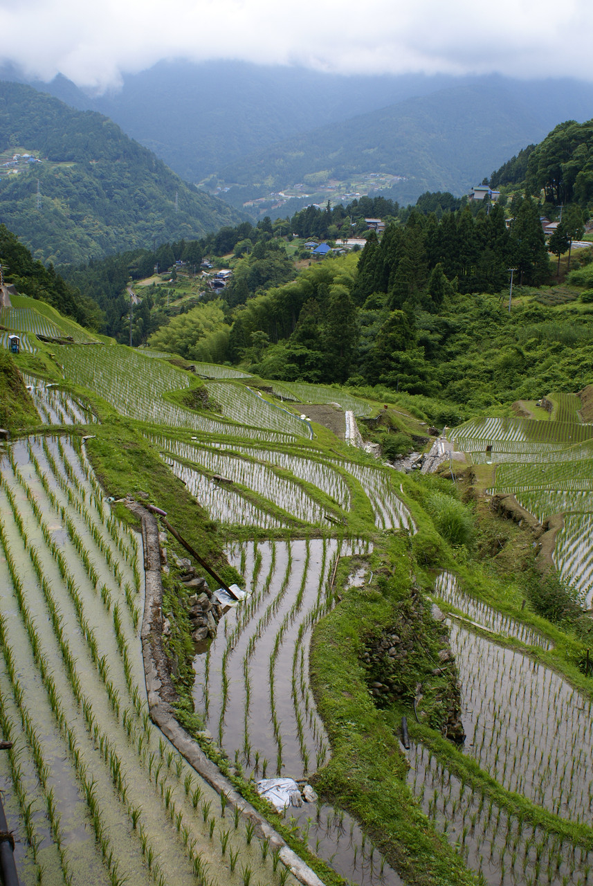 谷間深く立ち入ると幾重にも織なす棚田原が遠くの雲登る山々の風景に良く馴染んで綺麗である。