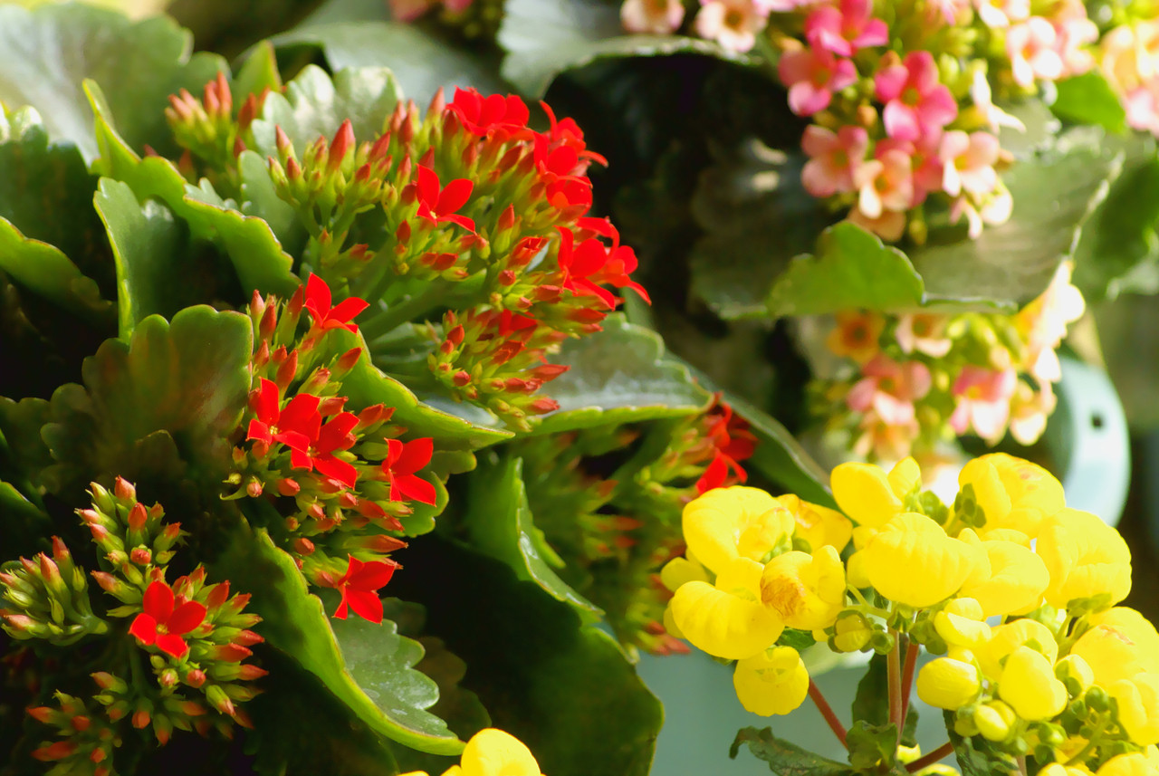 冬の温室で花々が競うように輝いていました。
