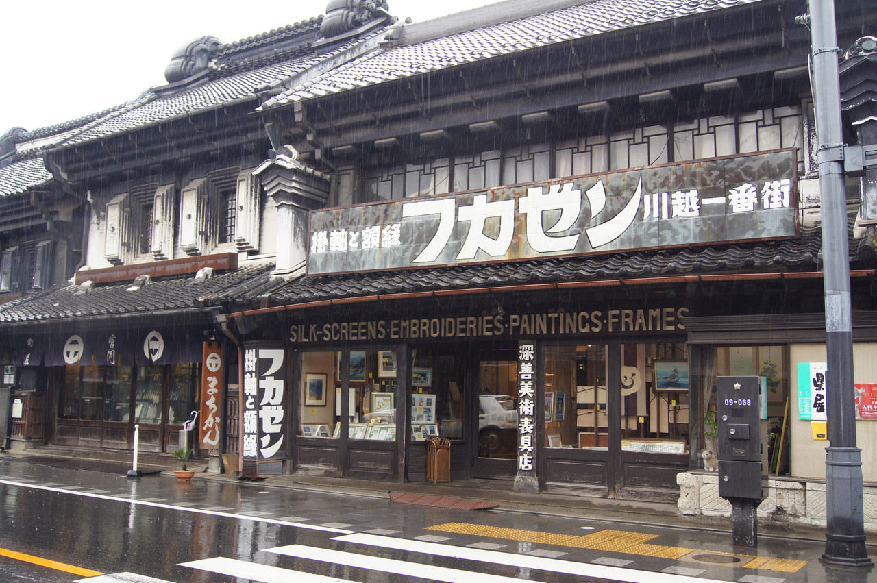 雨降りの川越の街並み。雨のしぶきとレトロな街並みが似合います。