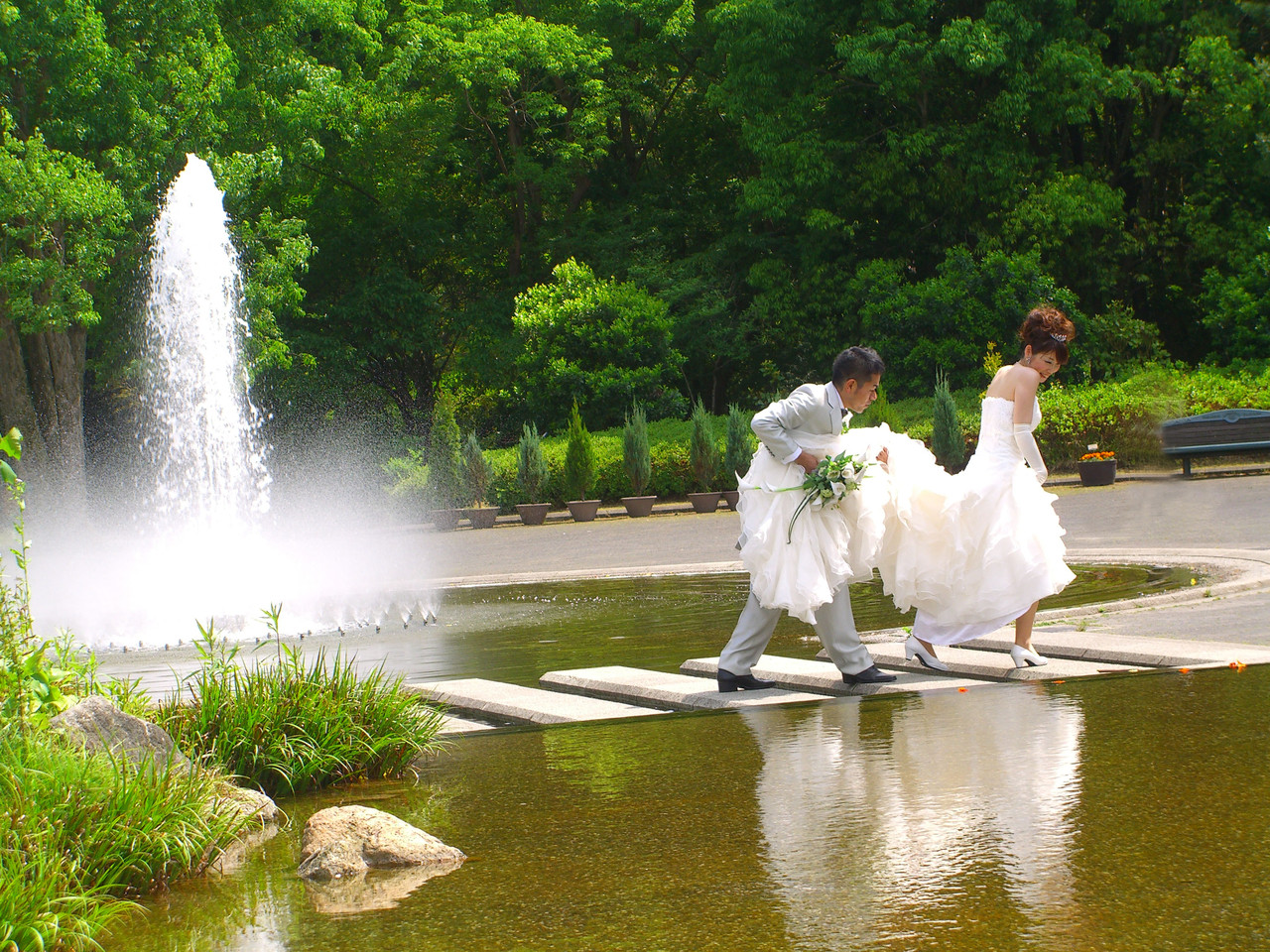 京都の植物園に行った時の一コマです。 新郎が一生懸命の表情に対して 新婦さんの笑顔がとってもかわいいですね(^_-)-☆ バックの噴水も祝福してますね♪
