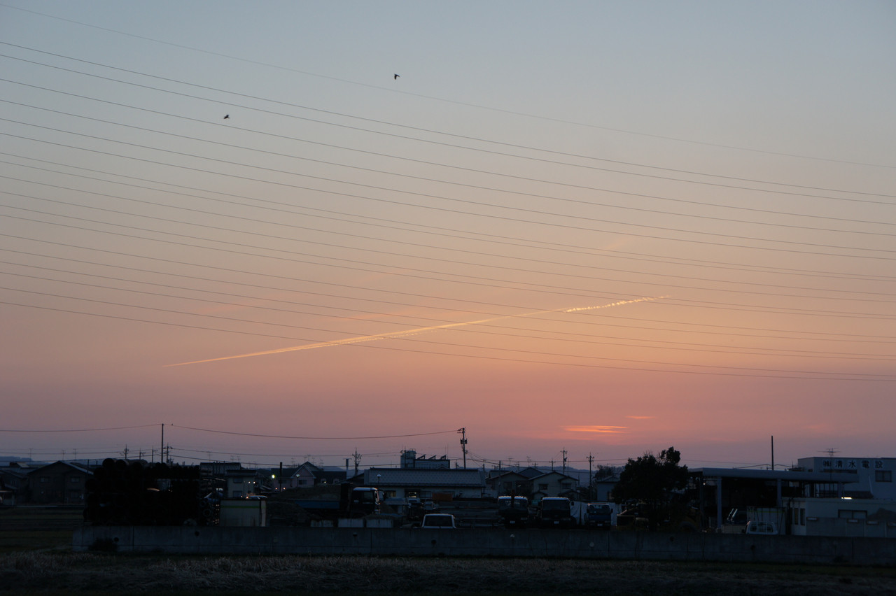 沈む夕陽を収めたかったのですが、間に合わず・・・代わりに照らし出された飛行機雲を・・・