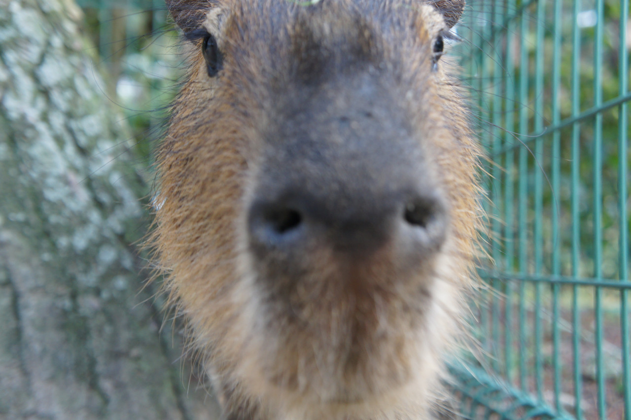 臆病なカピバラが木の裏にいたので撮影してたら、突然突っ込んできました…。