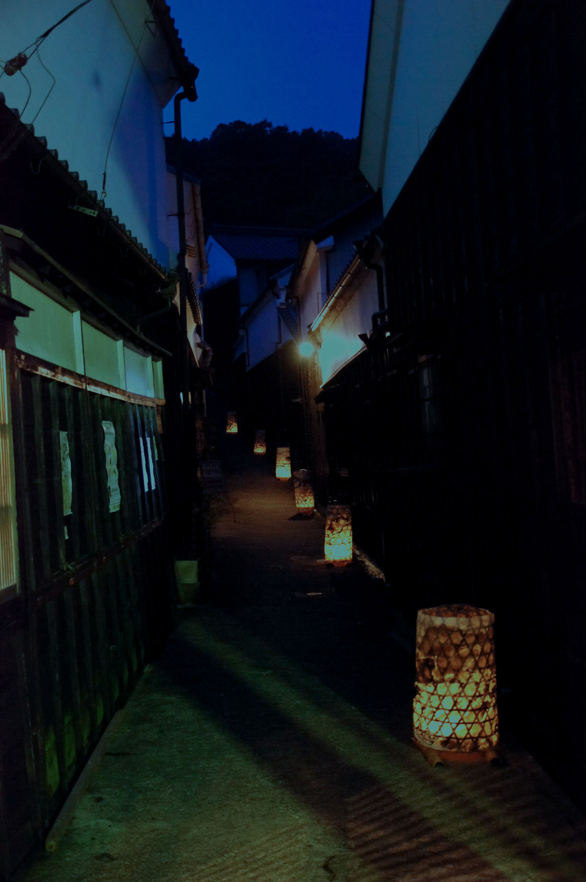 「たんころりん」と呼ばれる竹細工+和紙でできた照明具で日の暮れた街並みを照らすイベントがありました。フラッシュも三脚も使わずの手持ちでの撮影です。色あいを修正するためレタッチしています。