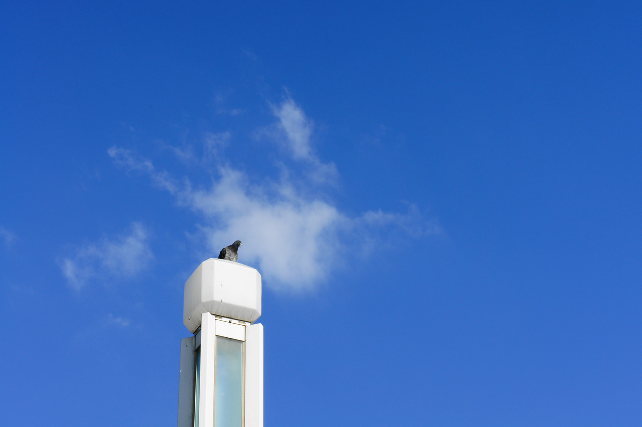 青空をふと見上げると高いところで一休みしているハト発見。 高みの見物をきめこんでるのかしら・・・とパチリ。