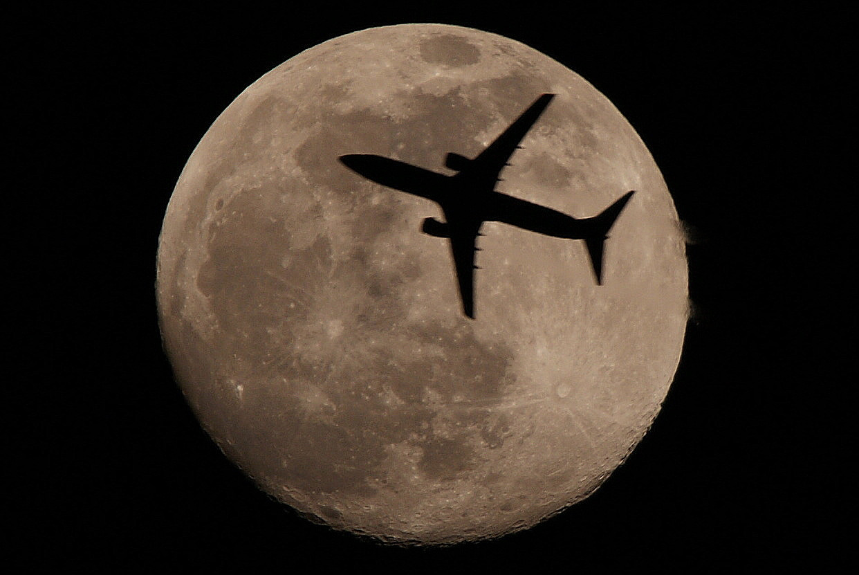 自宅上空が羽田→千歳、東北方面のルートに当たり一昨年末の夜、2日掛かり延べ4時間半待って一度だけ月と絡みました。