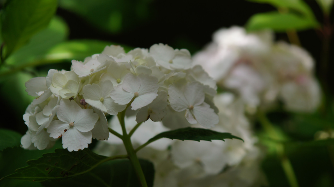 庭先に紫陽花が咲き乱れ、風に揺れていました。