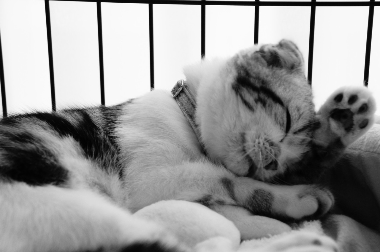 モノクロ撮影に挑戦。 幼いせいか、毛づくろいがまだあまり上手くありません。