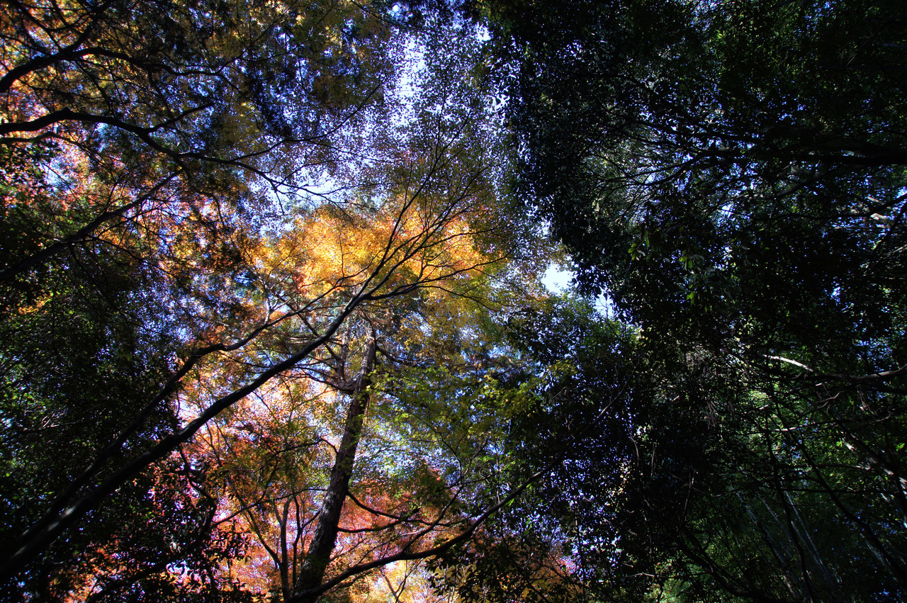 山道を歩く途中、明るい日差しに見上げると木々のステンドグラスがありました。