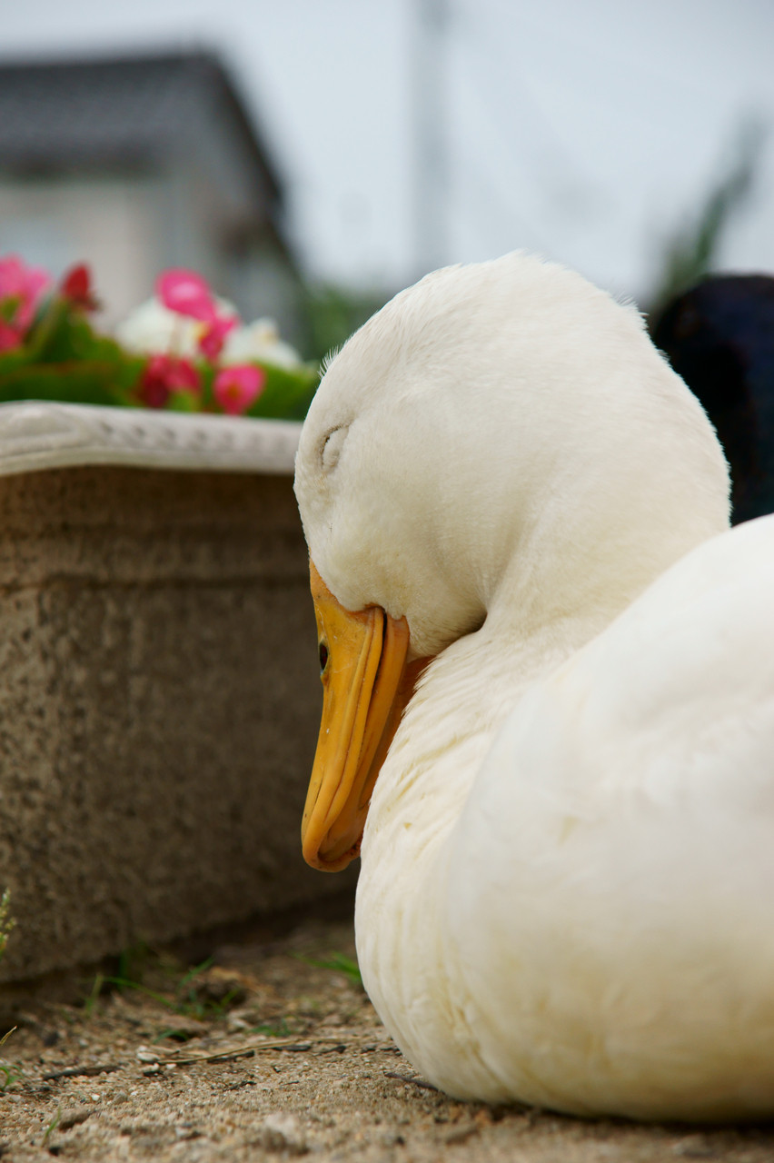このアヒル君と30分くらい行動をともにしてみました。 ごはん→おしゃべり→さんぽ→昼寝・・・ ええのぉ!