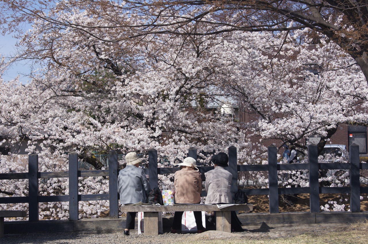 松本城のお堀で満開の桜を楽しむ仲良しおばちゃまズ