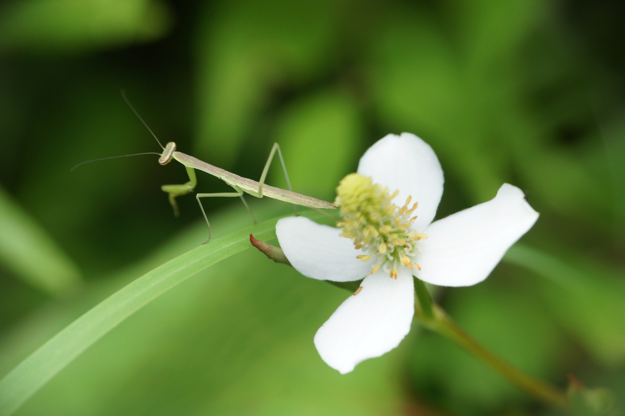庭のどくだみに赤ちゃんかまきりが止まっていた。 カメラをむけたら、一瞬こちらを向いて ゆるゆると逃げていった。