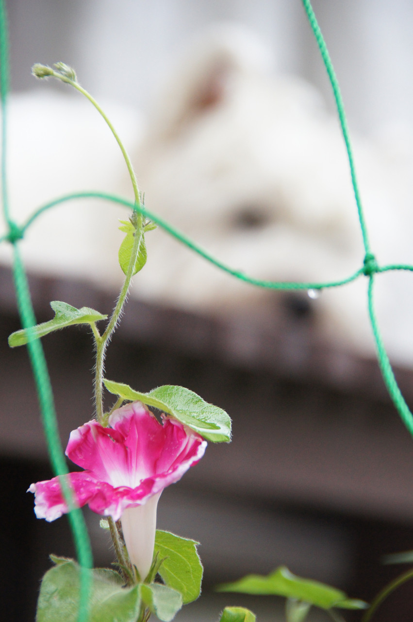 朝顔が一輪咲きました、 愛犬サニーは雨で散歩に行けずに退屈そうです。