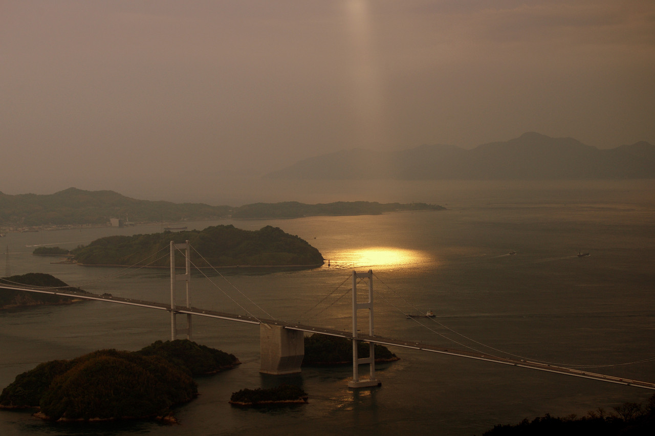 曇った空から突如一条の光が…… 神様が下さった贈り物です。 雲の動きが速いので、まるでサーチライトのように海や島を照らしてほんの1-2分で消えてしまいました。 この瞬間を撮れたのはラッキーでした。