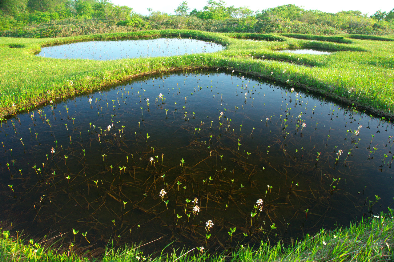 日が昇ってまもない時間帯の池塘(ちとう)群です。 ミツガシワが可愛らしく咲き始めていました。