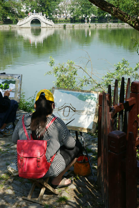 中国の世界遺産「宏村」でスケッチしてる人が大勢いました。 この橋を渡らないと村に入れません。