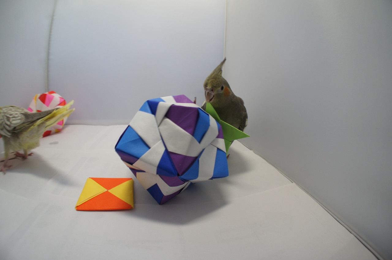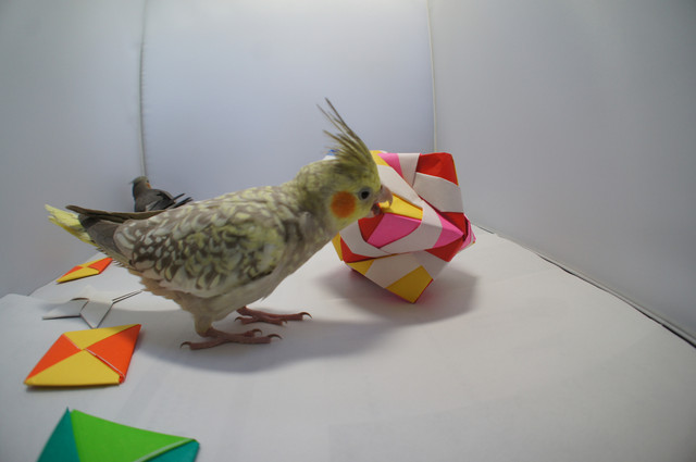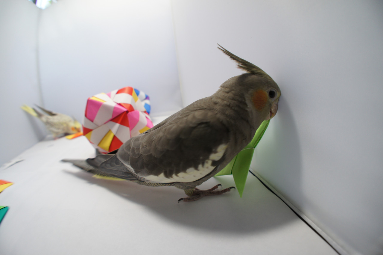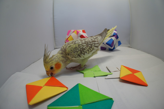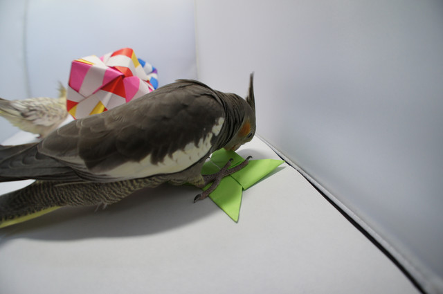 本日のお題は「オカメと折り紙」。実際に用意したけれどオカメたちに拒否された素材は結構あります。枇杷、ブドウ、ニンジン、スイカ。くっ。今回は事前に折り紙でオカメたちが遊ぶかどうか実験をしてから準備をしました。