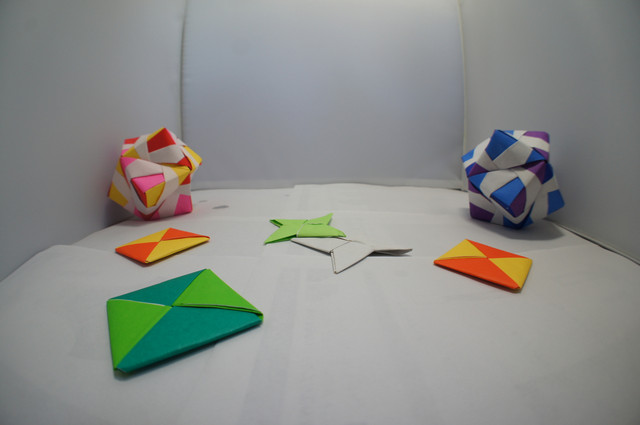 「じゃあわたしはお姫様ね」とシナモンちゃん。16面体の折り紙をつっついて転がして遊びます