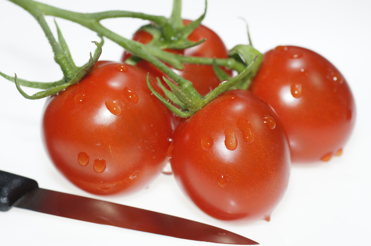 新鮮なフルーツトマト、ライトボックスの上で撮影。ライトとストロボで影を消してみました。