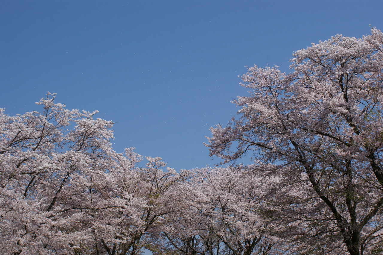 よく見ないと気付いてもらえないと思いますが、散った桜の花が風で舞い上がっているところなんです。青空に白く見えるのが桜の花びらです。この出会いに感謝です。