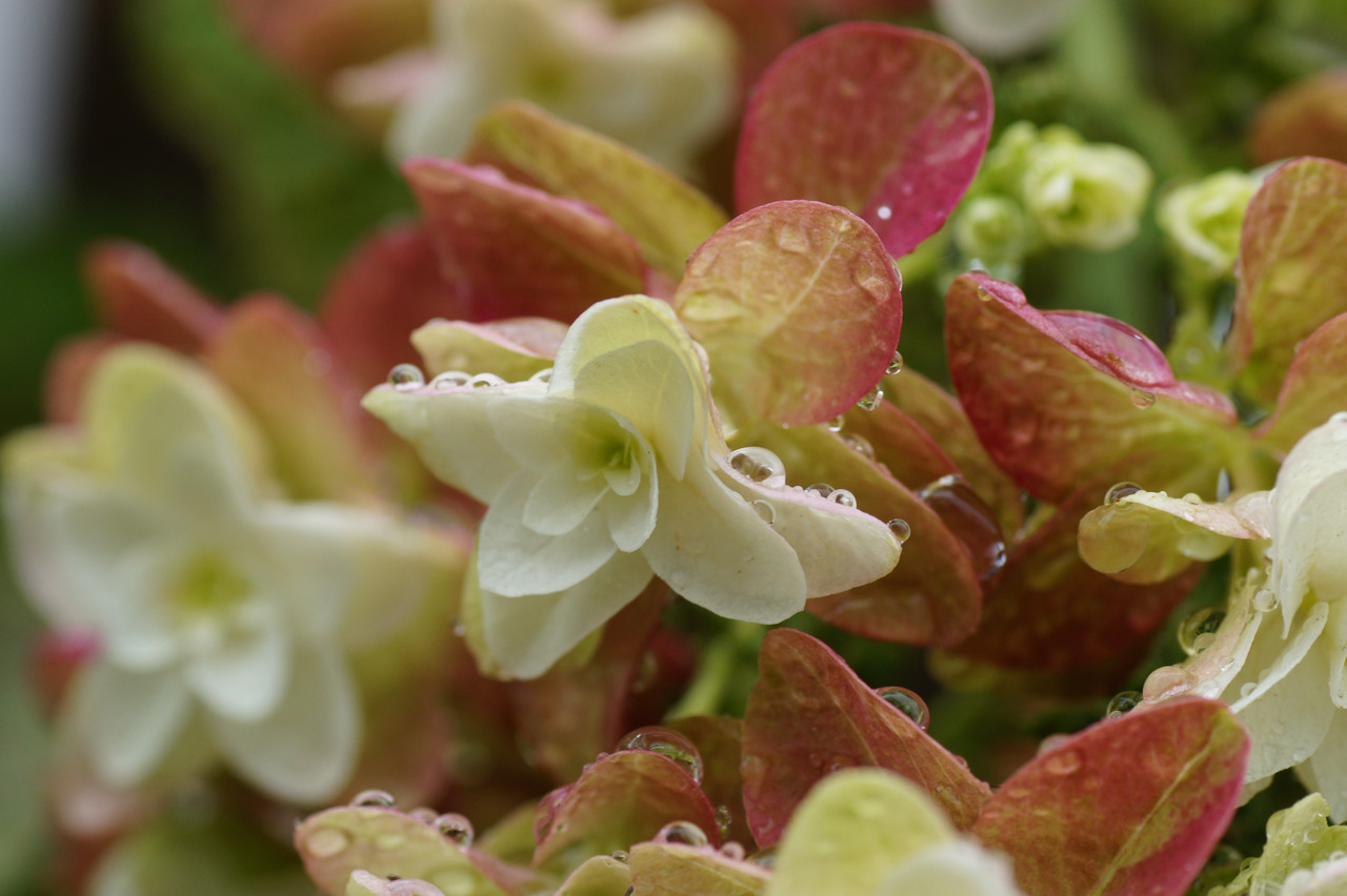 雷雨の直後晴れてきたのでカメラを持って散歩。 雨に濡れたカシワバアジサイが水玉を乗せてキラキラしてました。