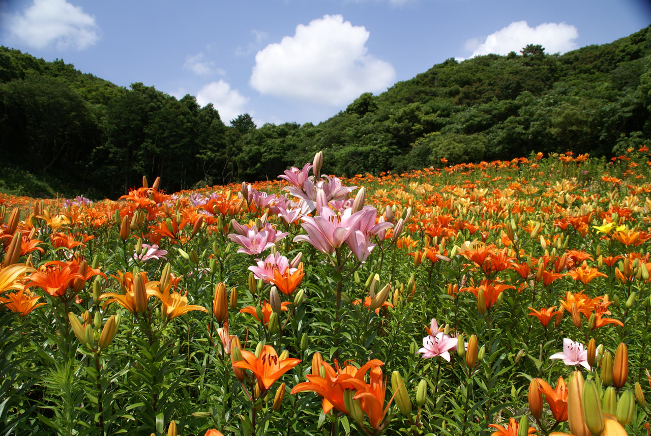 ユリの花が咲き乱れるさまを空を入れて切り撮る。
