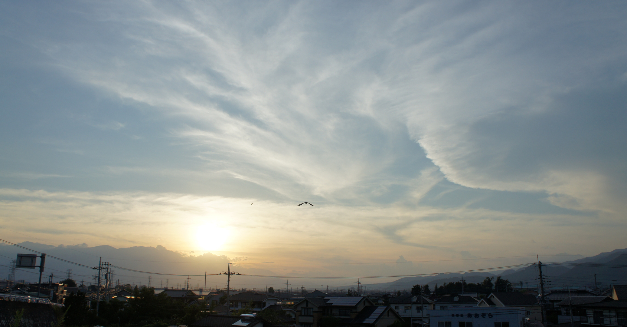 帰宅途中、夕焼けを撮ろうとしたら折良く鳥が一羽、過ぎて行きました。やっぱり家に帰る途中でしょうか?
