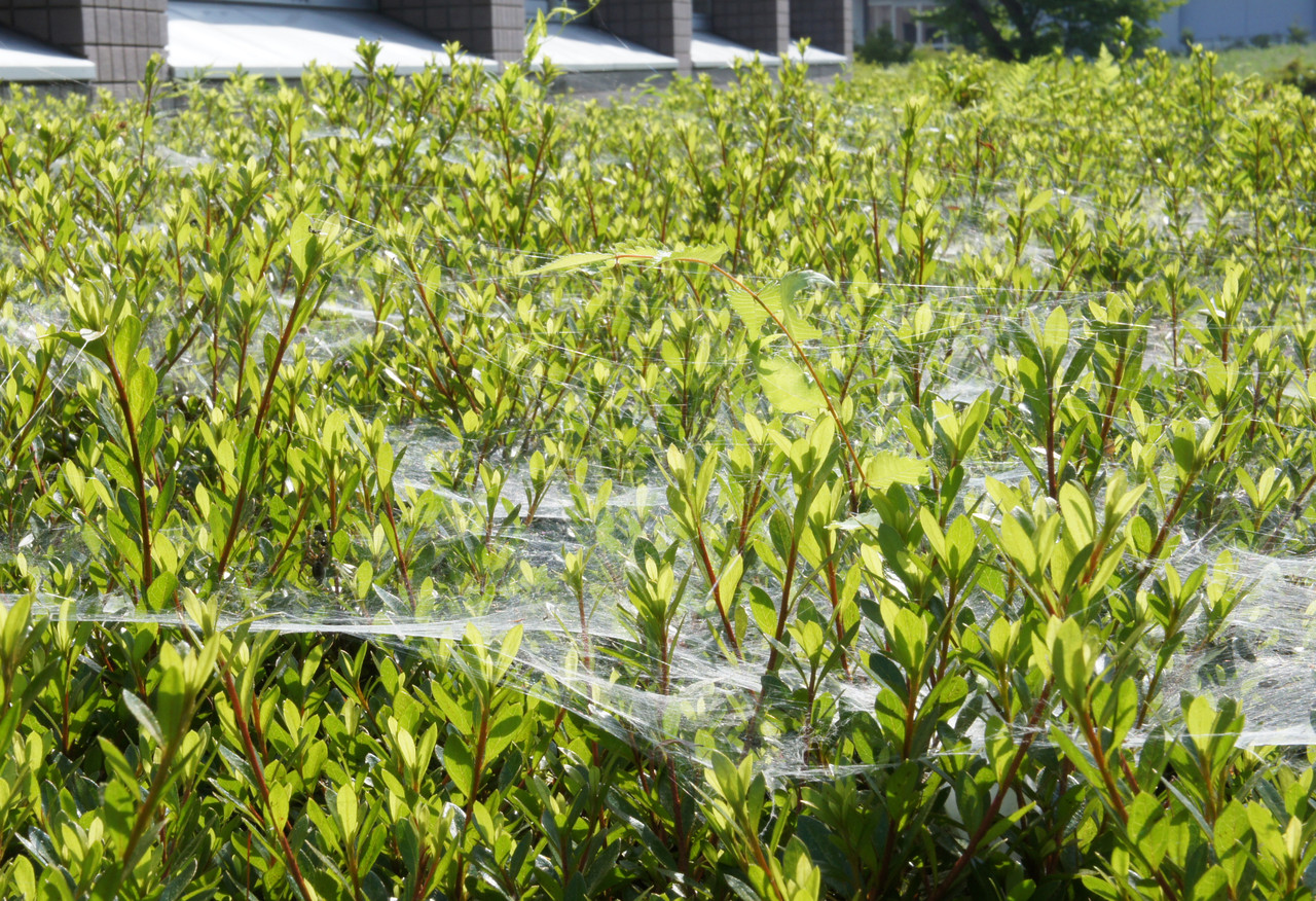 植栽にクモの巣がびっしり。緑によってくる虫たちを一網打尽にしようという戦略。