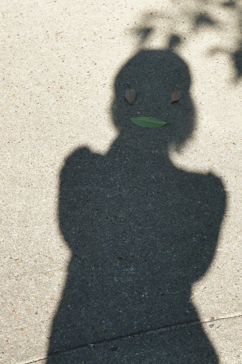 奥様の作品。 落ち葉をうまく使って顔にしたところ、たまたま葉っぱの影が触覚に♪ 面白い写真が撮れました。
