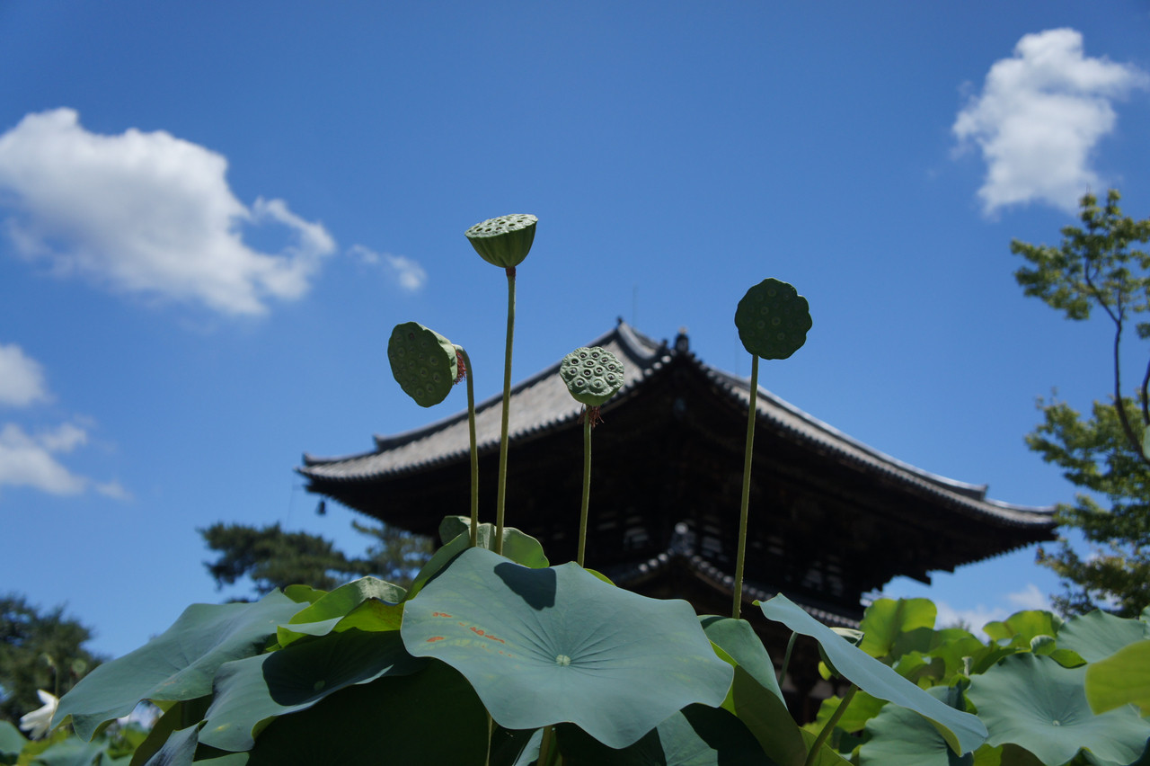 試みの大仏殿の庭で、蓮台が青いお空にそびえる姿が素敵でした。