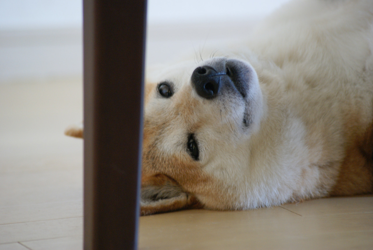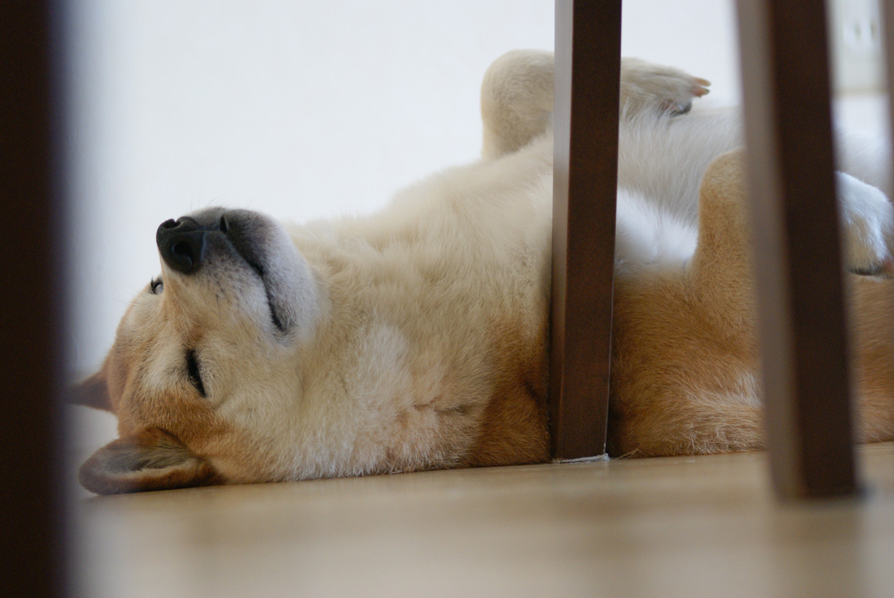愛犬ココアです。 夏になるとヒンヤリとした床の上でヘソ天姿で寝る事が多いです。 少しでも涼しくなる為の工夫の様です^^