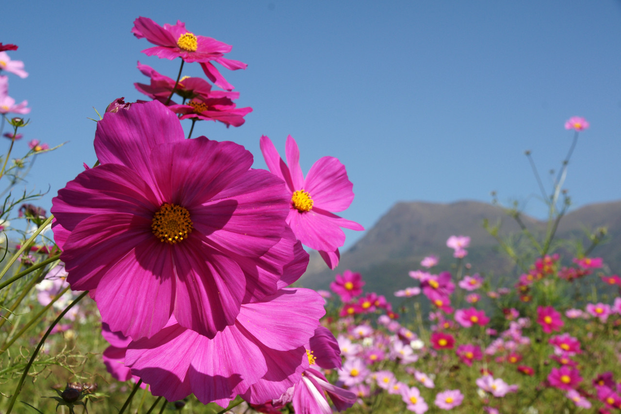 見渡すかぎりのコスモス畑。 青い空に、ピンクと白のコスモスが映えます。