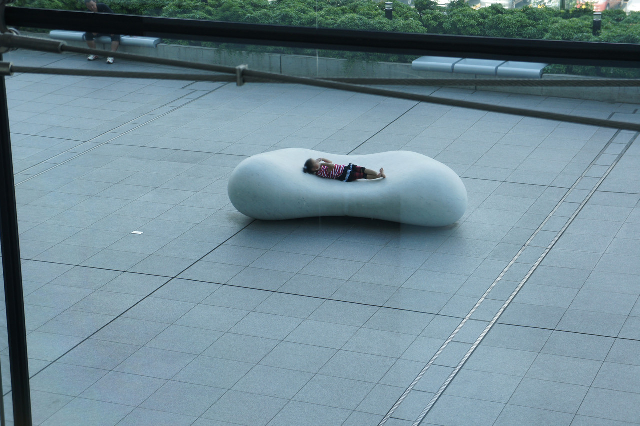女の子が気持ち良さそうに寝っ転がっているのは、公共スペースに置かれた安田侃の「天秘」という彫刻。その姿がとても自然に彫刻になじんでいました。(遠方からの撮影で許可を得ることができなかったので、一部画像処理を施しています。)