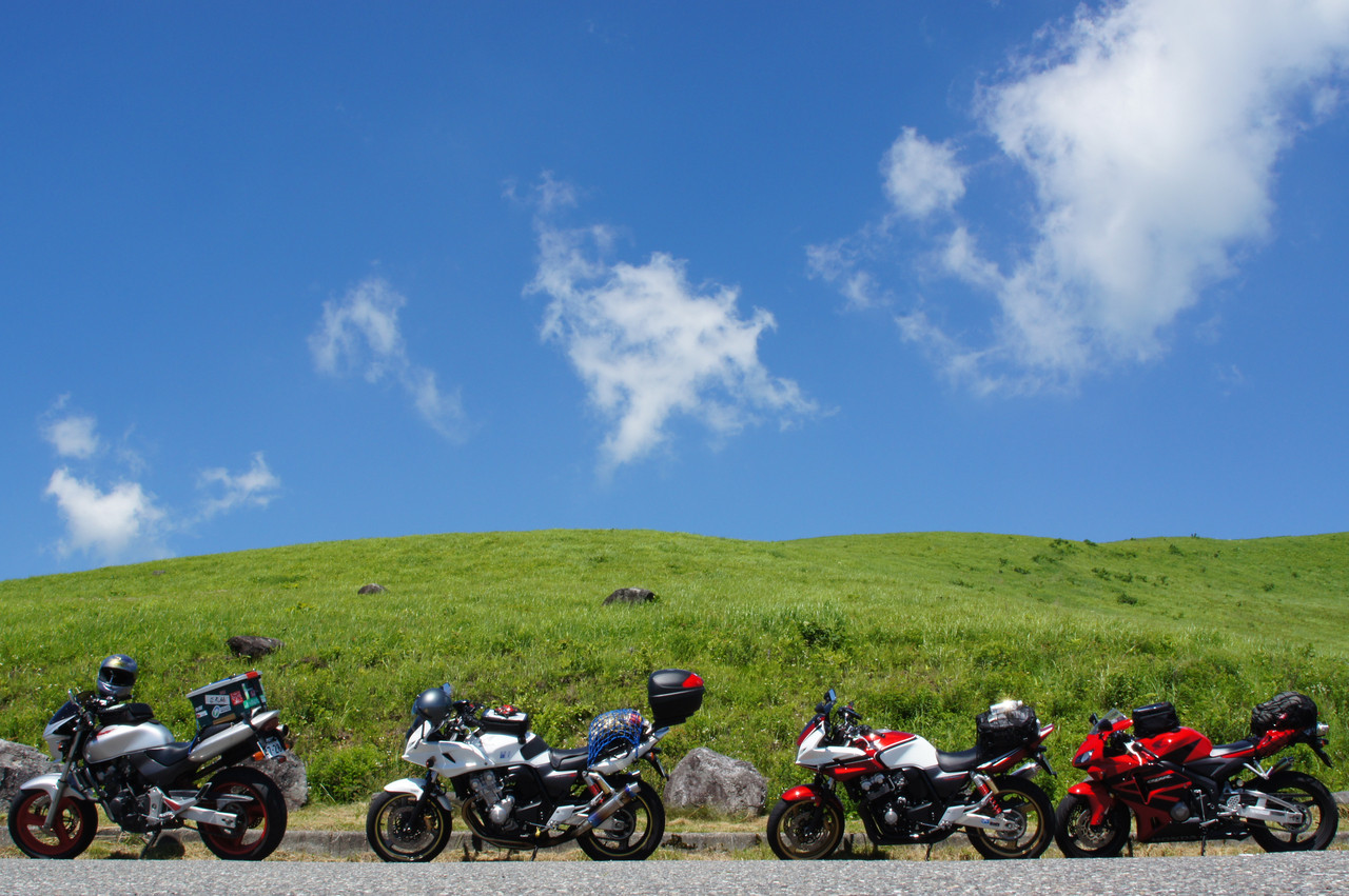 綺麗な青と緑を背景に、素敵な写真す。 バイクを等間隔に並べておけばよかったー