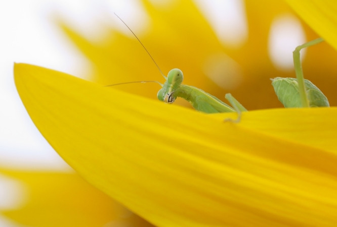 ヒマワリの花ビラに、『ハラビロカマキ』の幼虫がいました。