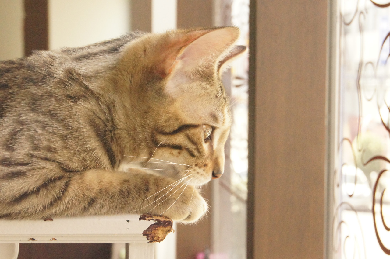 近所の猫カフェにて。真下の道路をキラキラした目で眺めてます。 ここのところオートで使ってたので、ISO感度を弄っていたのを忘れてしまってました。おかげで真昼なのにやたらざらついた写真になってしまったのが悔やまれます…(^^;)