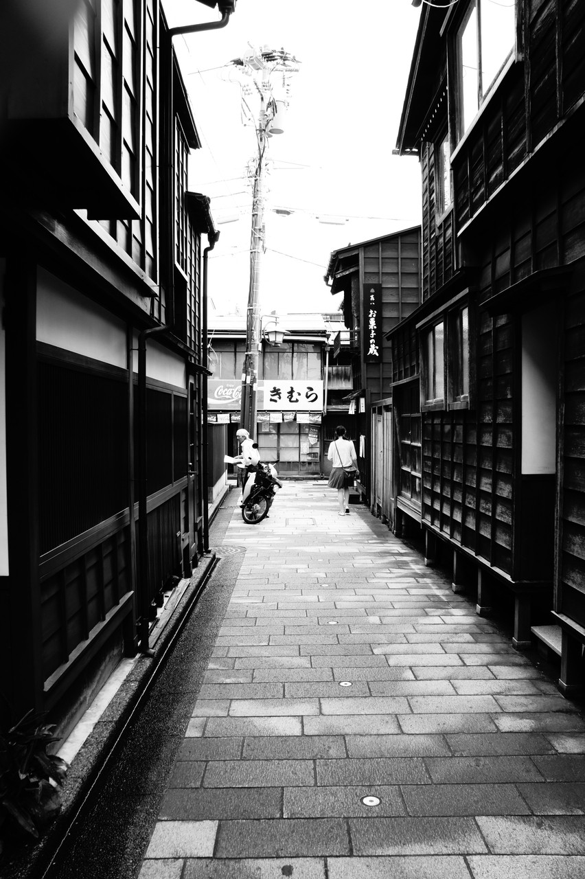 ハイコントラストで。昔ながらの街並みです。