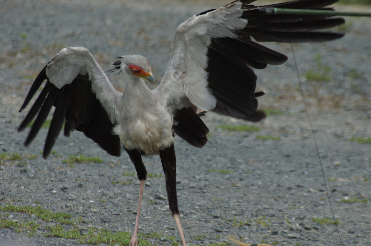 蛇を鋭いキックで退治するヘビワシです。この足からは想像できないキック力で蛇をやっつけます。 右に見える線はデモンストレーション用の蛇を繋いでいる糸?です。