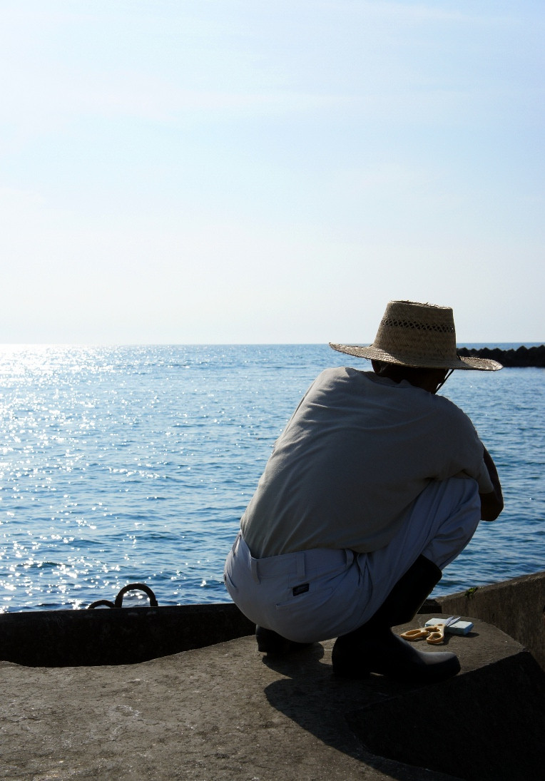 テトラポットで釣りをしているおじさんに話しかけて、写真を撮らせてもらいました。 麦わら帽子が似あってます。
