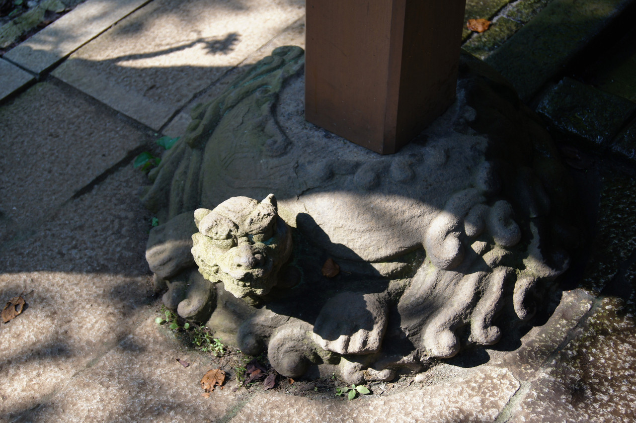手水舎の柱。 置き石が亀なんですけど、動けねぇとか言ってそうで…。