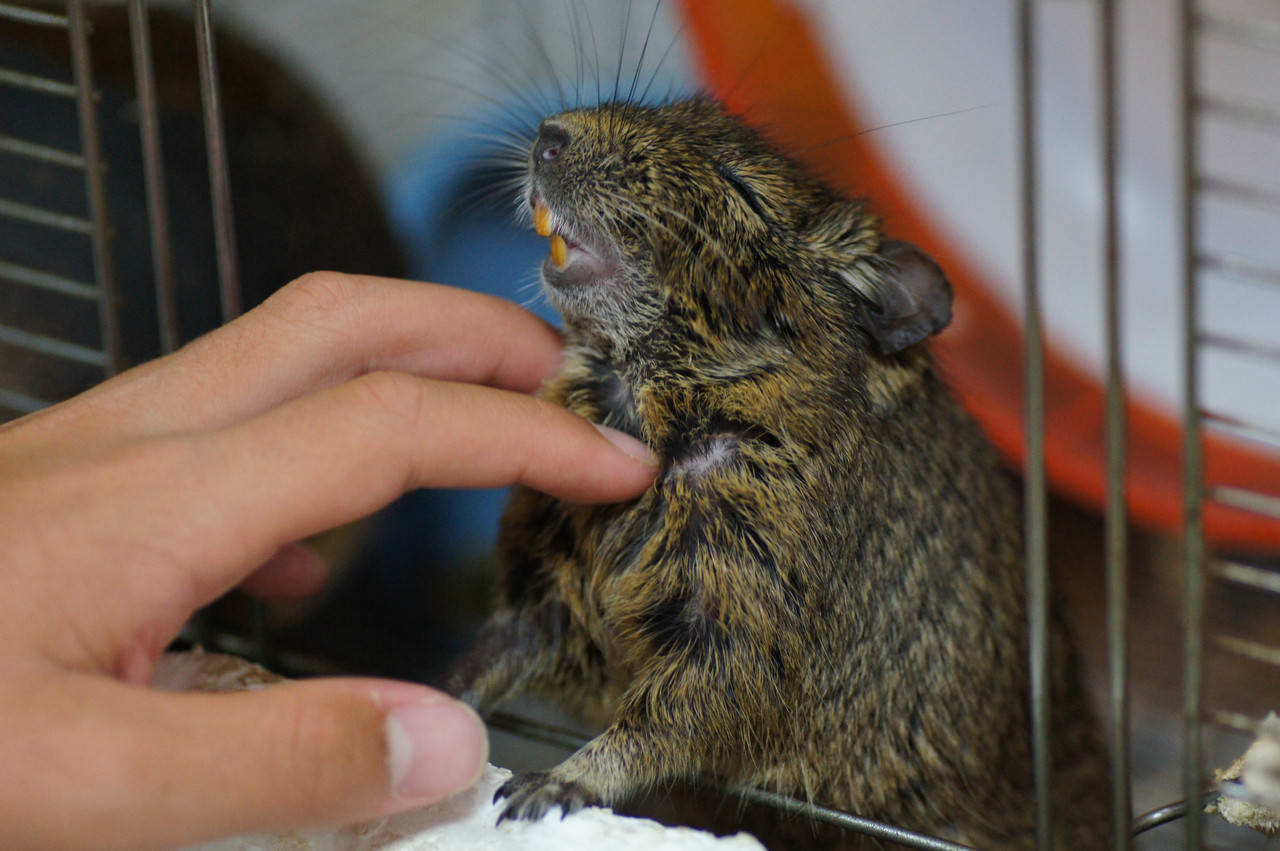 デグーっていうミッキーマウスのモデルになったネズミさんです。 まさに恍惚の表情、齧歯類特有の歯もむき出しで、よっぽど気持ちええんでしょうねぇ。 もっと警戒しなさいって突っ込みたくなります。