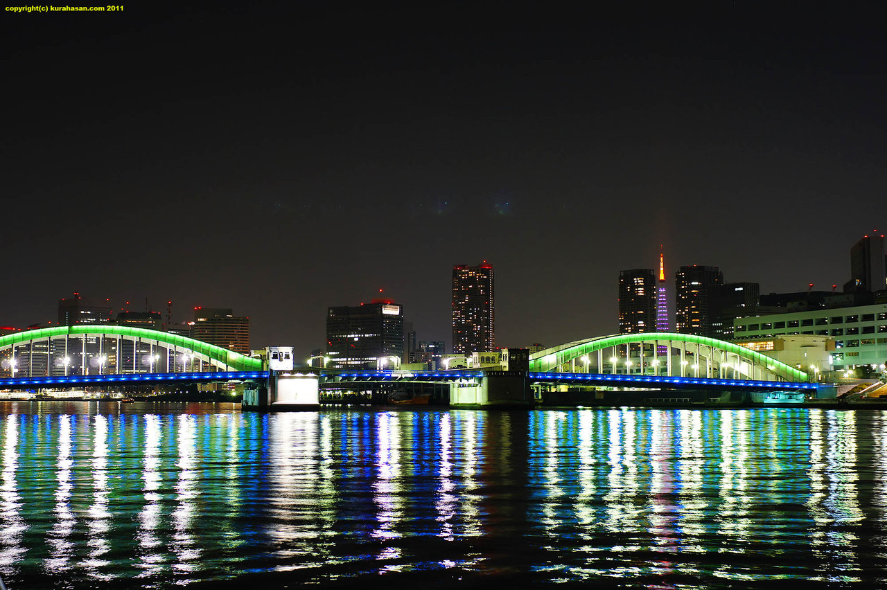 鉄も夜景も撮影します。 まだ震災前で電力が豊富だった頃、ライトアップされていた勝鬨橋です。 東京タワーがタケノコのように”生えて”いました。