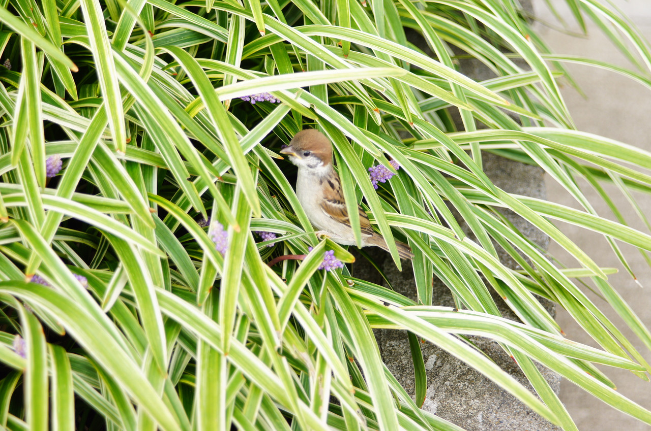 飛行訓練中に植え込みに落ちたようです。 動転していたようで近づいても逃げずにキョロキョロしていました。 そのうち親や兄弟が騒ぎ出したので、飛んで逃げて行きました。