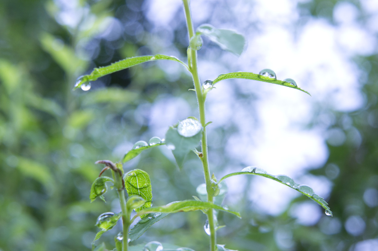どしゃ降りの後の葉っぱは重そうです