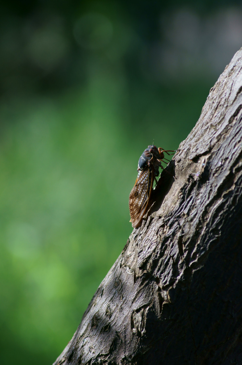 久しぶりの天気の日に 公園でたくさん鳴いていた蝉をみつけました。 低めのとこで鳴いていたのでパチリ