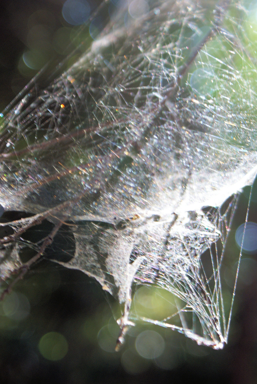 綺麗な形の蜘蛛の巣ではありませんが・・ 光に浴びて輝いてしました