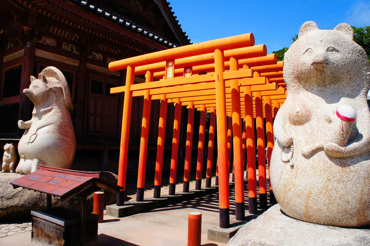 蓑山大明神の太三郎狸とお嫁さんです。 蓑山大明神は、四国狸の大将「太三郎狸」を祀っているそうです。 青空の下の赤い鳥居です。